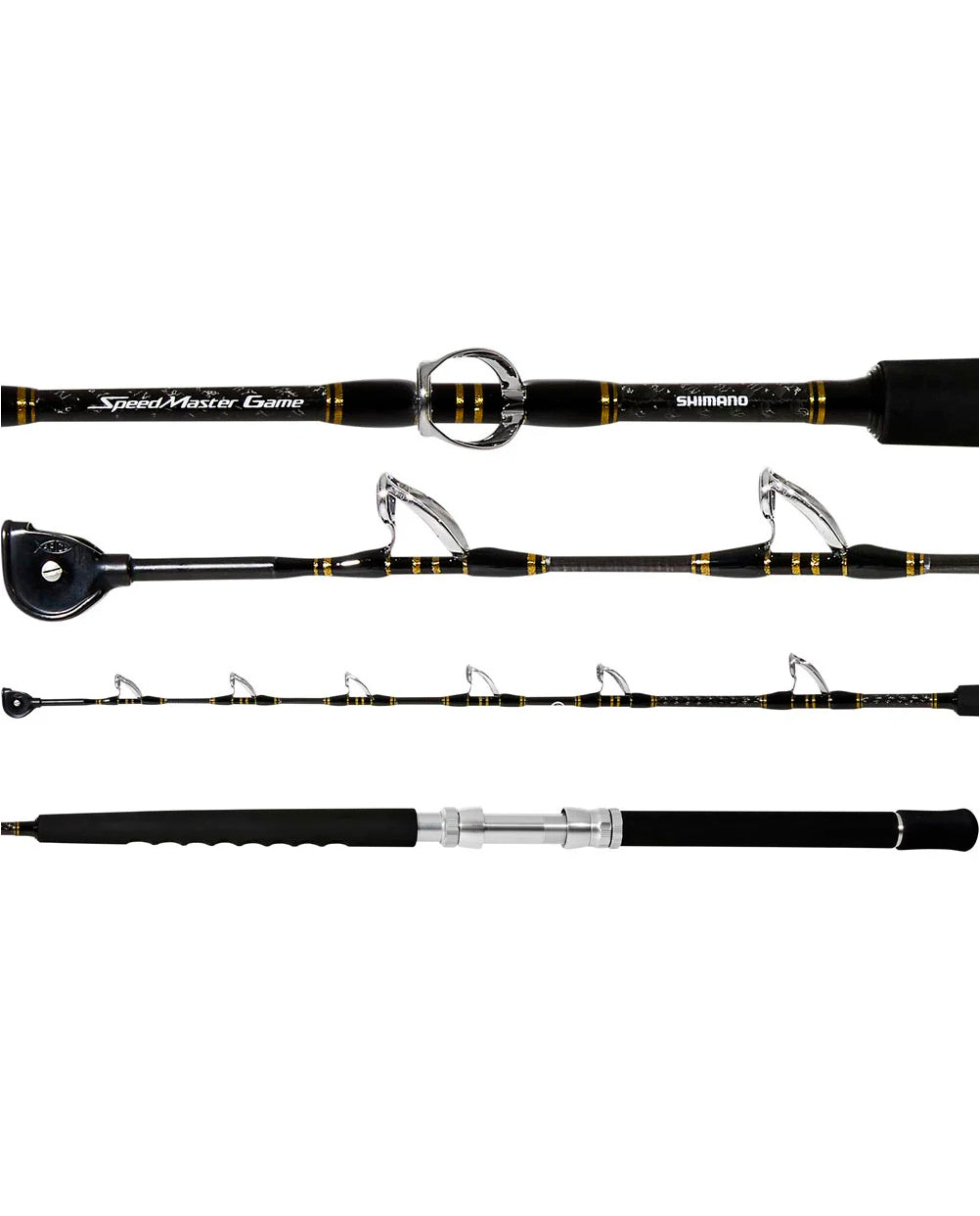 The new Speedmaster game series utilises Shimano's strong and lightweight TC4 blank technology to deliver a dependable tournament game fishing and deep drop line-up. Quality Fuji SiC guides with an AFTCO Roller Tip provides control and preserves the performance of your line during the fight and ensures you keep the upper hand against whatever you may hook. To guarantee your favourite Shimano game reel fits perfectly to the rod. an aluminium Pac Bay reel seat and channel lock butt is used for the ultimate in strength and durability. This is especially important as the strength and rigidity of your outfit will be upheld when under fighting load. Tested on some of Australia's hardest fighting game fish. the Speedmaster Game series covers 5 models across 15-. 24- and 37kg line classes for trolling and livebaiting. including a dedicated 7' 24kg land based game (LBG) rod and a 5'6 PE 8-10 deep drop rod.