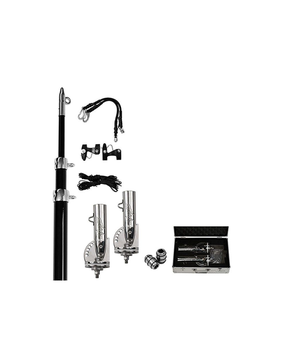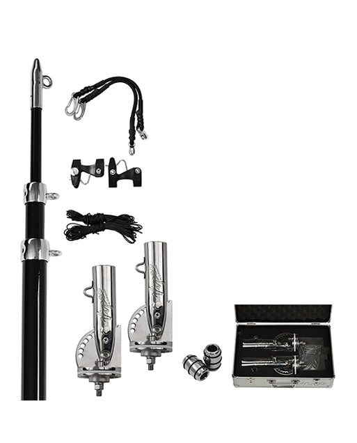 Bundle pack includes. Telescopic 3 Stage 4.8m Outrigger Poles. Side Mount Bases. Line Kit. Stainless Tag Return Weights. Quick Release Clips. Bungee Cords with Stainless Clips and Stainless Pulleys. Stainless Sandwich Plates. Stainless Mounting Hardware and a Convenient Foam Filled Silver Carry Case.